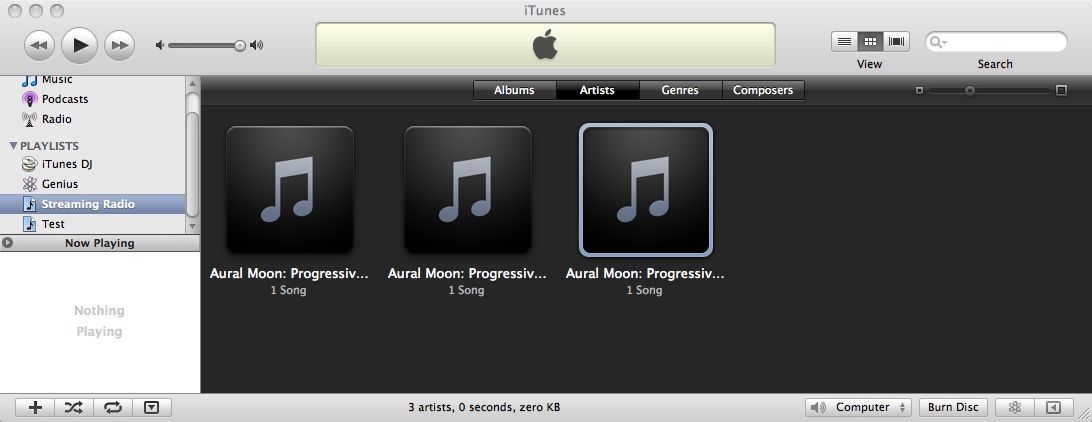 10.5.7 (intel) iTunes 8.2. The behavior is this: It seems that there's a facility to allow the album art to change dynamically to reflect the album playing on the stream. Thus, while the stream is playing [providing the art drawer is showing 'currently playing' and not 'selected item'] the drag target is presented. When the next ID comes along in the stream the art gets associated with it and appears in the view. Under many circumstances the last dragged art is retained. This is probably a bug - since, I guess, the art should relate to the currently playing album and not the source. Anyway a large variety of actions - often including changing the view type cause the art to be cleared back to empty. For example, stopping the stream and then changing from the radio playlist to another and back clears it every time I've tried. There might be some subtle additional action or description that you've attached to the source that changes this behavior - but that's what I find with a stream added to iTunes with default options. I suppose that if we embedded the station logo in the stream ID tags (if that's even possible, with SAM) it might work - but there's a risk that some players might barf on that....