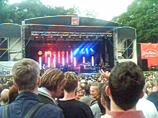 PG's gig was different by far to Genesis. Basically it was outdoors and 10 times as less listeners (3000). This was a luxury in more than one sense. Getting out of Hamburg was easy this time so I was home much earlier and of course one wasn't that far away from the stage. I was though further back for the sounds sake, but PG doesn't play loud anyway. Having seen PG 4 times before this time he was back to basics as there were no gimmicks - just plenty of florescent lights at the back (see photo). With PG were the usual gang Tony Levin, David Rhodes, Peter Gabriel: Keyboards, Vocals, Angie Arnold : Keyboards, Richard Evans : Guitars, Flute, Ged Lynch: Drums .Melanie Gabriel: Backing Vocals & Samples. The big difference from earlier gigs with PG was what he played. He played what the fans have said they wanted to hear and that is songs from his first 4 albums. And that is what he played. The Rhythm Of The Heat On The Air Intruder DIY Blood Of Eden Moribund The Burgermeister I don’t Remember No Self-Control Lovetown Schnappschuss (ein Familenfoto) Steam Mother Of Violence (vocals Melanie) Humdrum Big Time Not One Of Us / Du Bist Nicht Wie Wir Lay Your Hands On Me Digging In The Dirt Solsbury Hill Sledgehammer In Your Eyes Yes and he sang a bit in German. And he spoke a lot of German (from a script but also a bit without a script) He stayed mostly behind his keyboard but he did take control of the stage especially towards the end by moving around and down to the crowd. Being a crafty fellow he made sure of 3 encores and getting the crowd behind him. So for a PG fan this was a great gig with just the old hits and a couple of tunes I've never heard live. The only disappointment was his daughter Melanie who doesn't have a stage presence and singing solo didn't have any power behind her voice. Tony Levin was great as always - I know of no other better bass player except of Chris Squire while David Rhodes only had a 6 second solo. PG is coming to Dk in August but it's already sold out (part of a festival) - I'm trying other channels to see him again - it was fun.