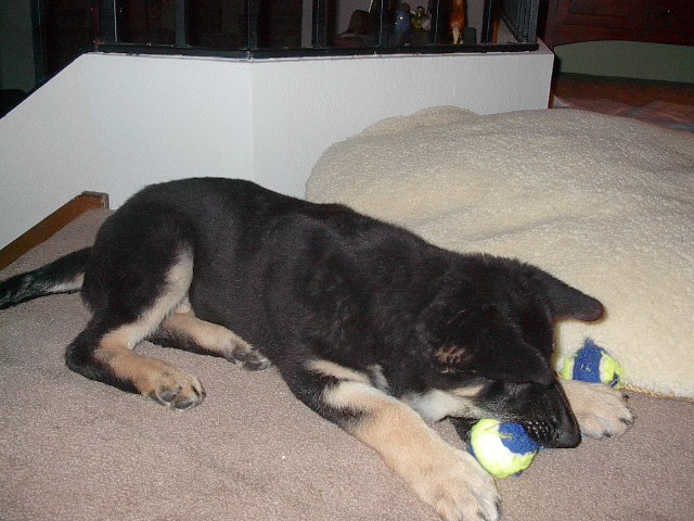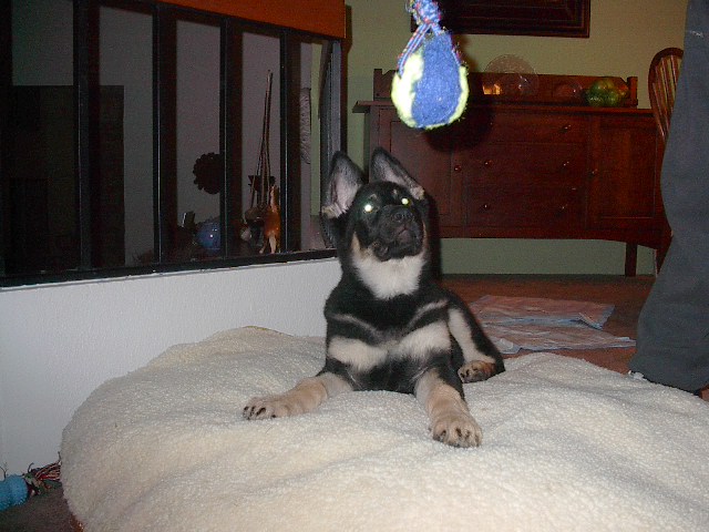 name his dog?) a German (import) Shepherd @ 2/ 1/2 months. He's now 117 lbs. of pure muscle, a champ frisbee dog. His jump's been measured (head level) @ 9 ft. during a catch. Curves, floaters, no sweet spots, he catches them all. K