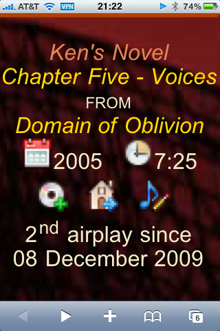Since November of 2009, I've downloaded over 20GB of data on my 3GS, a lot of being Auralmoon's 128k stream. Lately I've been using Normsoft's Pocket Tunes. Their most recent software release (less than an hour ago from this posting time) provides support for iOS4 and "multitasking", so I'll put the two of these reviews together. The net-net is this is a GR8 upgrade. The phone now can happily stream the radio station and allows use for other work to be done at the same time. It also appears that Safari allows for better zooming in on the now playing area of the webpage which means even us old geezers can read the artist/song info at a distance while driving. I'm including a sample so you can see how it looks.