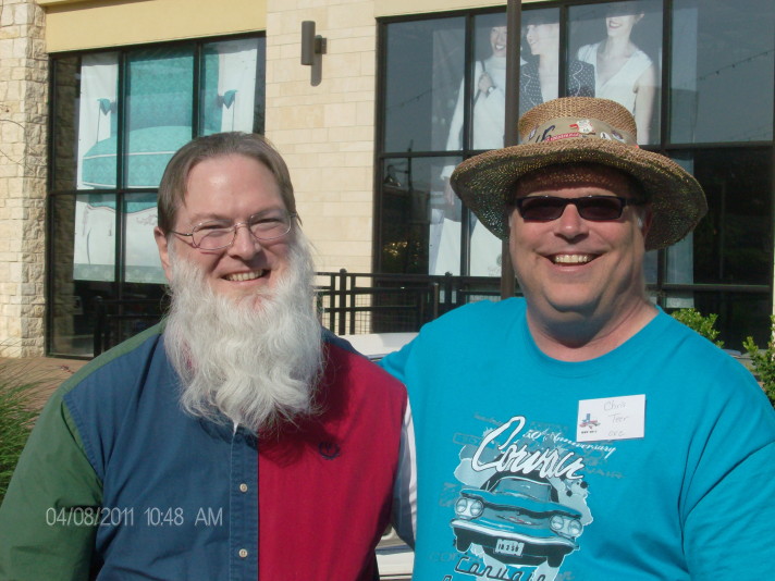 Chris Teer (Teerminator) and I met up at the Heart of Texas (HOT) Corvair show at the Hill Country Gallaria in Bee Cave, TX (outside of Austin, TX) today. My wife (Carol) and I drove over and visited with Chris. He was picked last night to be one of the judges for the event - so we didn't have a lot of time to talk - but we enjoyed each others company and had a good time. We got to see Chris' red Corvair convertible. It was fun to be with Chris and hear about his passion - he owns two Corvairs - one for 25 years. Below are some pictures of our time their. The pictures: 1) Ted Neil & Chris Teer, 2) Carol Neil (Ted's Wife) and her favorite - a purple Corvair, 3) Chris' Corvair - Interior, 4) Chris' Corvair - Engine, and 5) Ted in front of Chris' Red Corvair convertible. Regards from Texas, Ted |